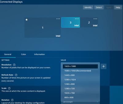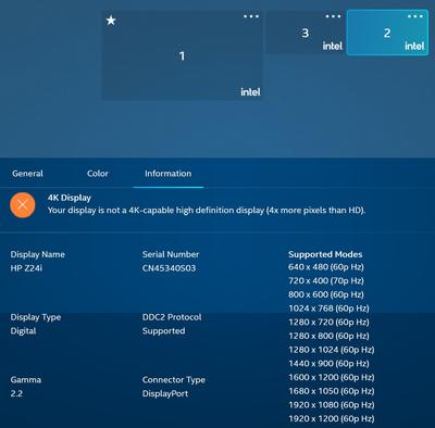 Windowsin Display asetuksista ei saa 1920x1200 resoluutiota valituksi, 1920x1024 on paras mitä valikkoon ilmestyy. Intel Graphics Command Center sama juttu, näyttäisi siltä että itse telakka ei vaan suostu välittämään 1920x1200 resoluutiota. 1920x1024 näyttää kuitenkin valitettavan tuhnuiselta ja vääristyneeltä kun näyttö skaalaa sen väkisin 1920x1200:lle.