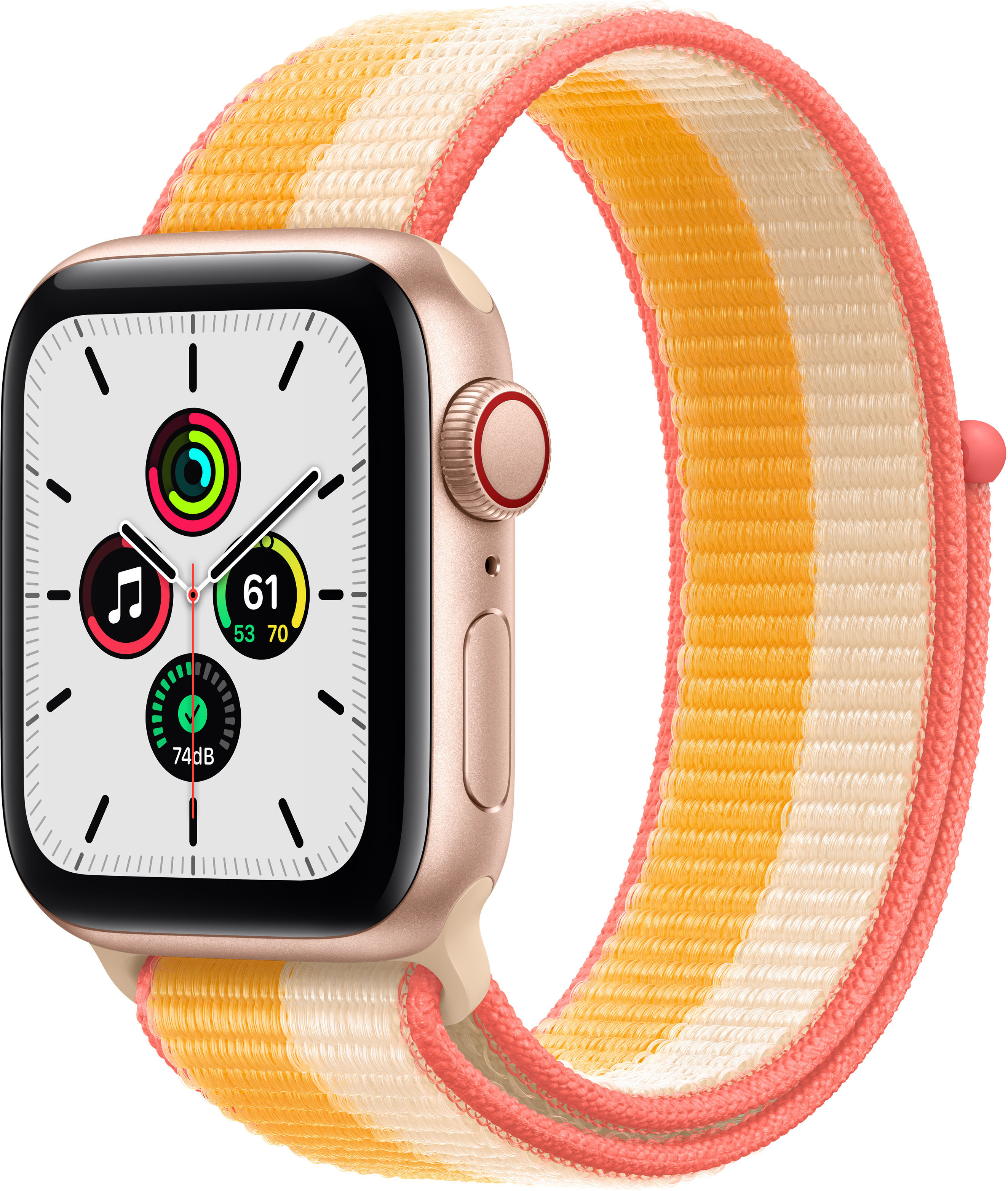 Apple Watch SE (GPS + Cellular) 40 mm kullanvärinen alumiinikuori, ruskankeltainen/valkoinen Sport Loop -ranneke