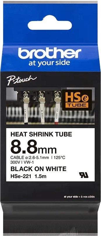 Brother HSE-221 -kutistesukk, mustalla tekstillä ja valkoisella pohjalla, leveys 8,8 mm