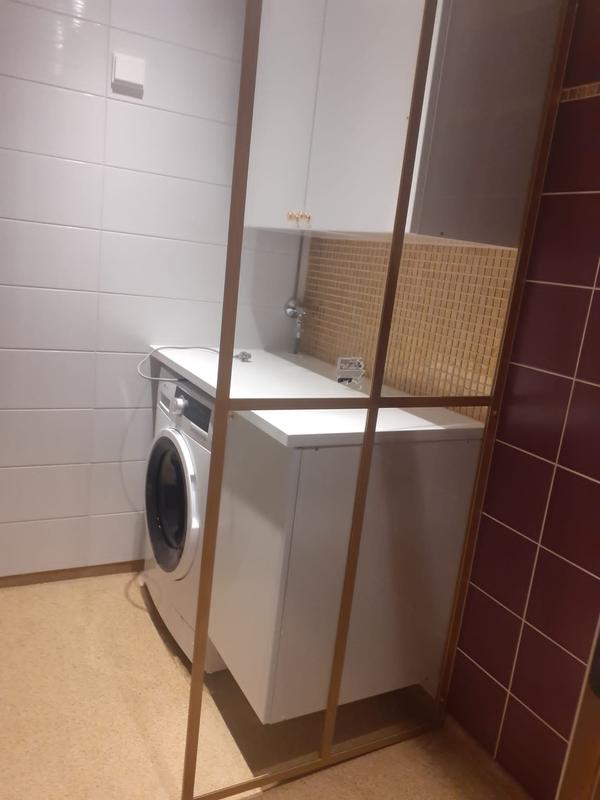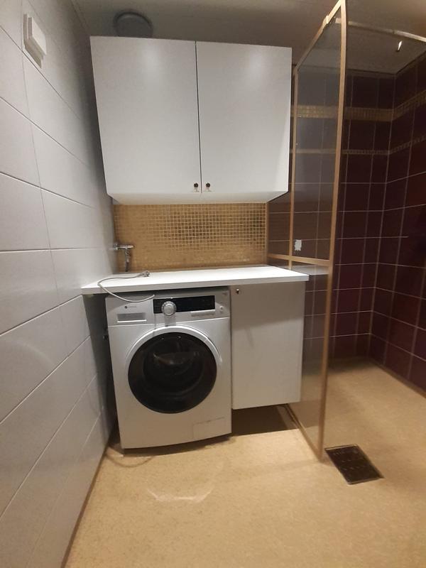 Mukana tullut tulovesiletku oli onnettoman lyhyt, sähköjohto saisi myös olla ainakin 0,5metriä pidempi. Mutta tähän asennuspaikkaan riittävät. Yllätyin positiivisesti, että jalat sai säädettyä normaalilla lenkkiavaimella, joten koneen vaateriin saaminen oli helpompaa kun yleensä.