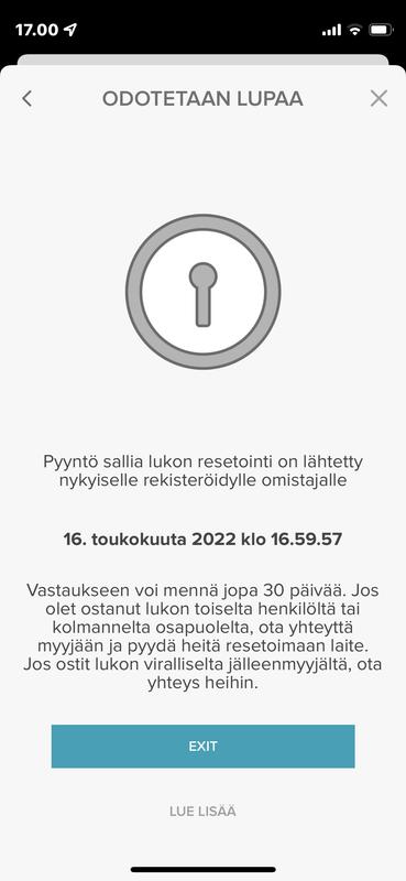 Toimii aina ehkä 5 min jonka jälkeen ei sovellus enää saa yhteyttä lukkoon, ensin ilmoittaa "tuntematon" jonka jälkeen ettei yhteys onnistu. Yrittää korjata yhteyttä käynnistämällä bluetoothin yms. mutta turhaan. Puhelimen uudelleenkäynnistyskään ei auta. Ainoa keino saada yhteys takaisin on käynnistää lukko uudestaan tai käyttää lukosta patteria irti. Tämän jälkeen taas yhteys pysyy sellasen 5min. 🤦