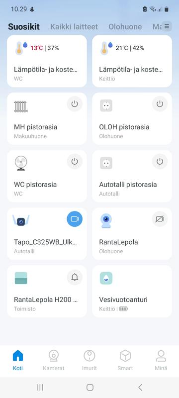 Tapon valvontakamera tuotteita ollut käytössä jo useamman vuoden. Nyt ohjattavat pistorasiat liitetty mukaan järjestelmään. Toimivat hyvin ja niinkuin olin ne ajatellut. Samalla app:llä ohjautuu mökin ja kodin laitteet.