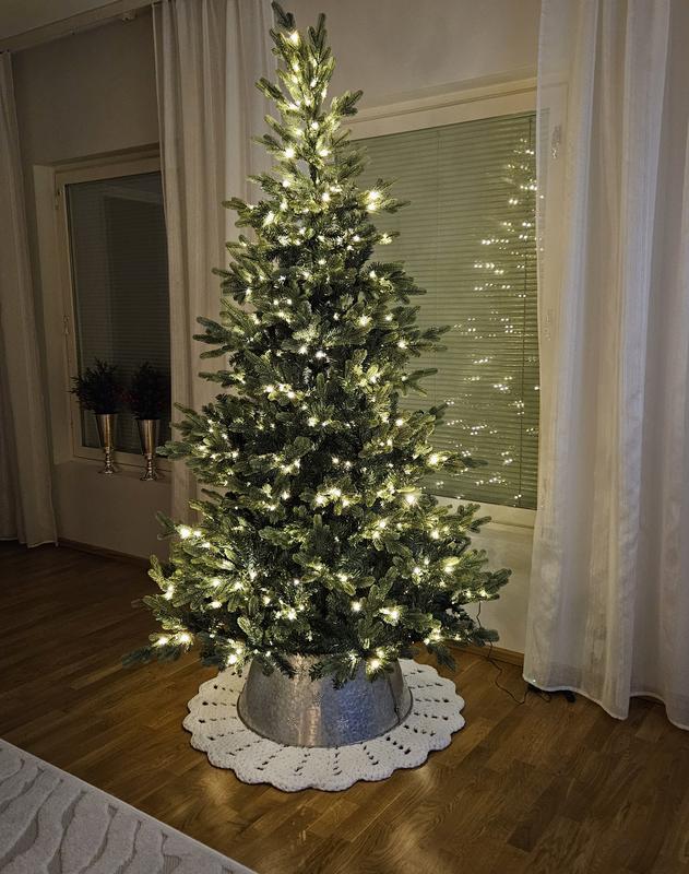 Kaunis ja aidonnäköinen kuusi. ”Havut” kahta eri materiaalia, jotka kahta eri vihreän sävyä. Kauniit lämpimät valot, joita on riittävästi. Valoissa kahdeksan eri asetusta ja ajastin. Helppo ja nopea koota ja kytkeä.