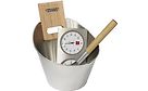 Saunatarvikesetti sisältää ruostumattomasta teräksestä valmistetun kiulun, kauhan ja selkeänäyttöisen kosteus- ja lämpömittarin, jotka viimeistelevät saunasi tyylikkään sisustuksen. Saunatarvikesetti on mainio lahjaidea esim. tupaantuliaiseksi.
