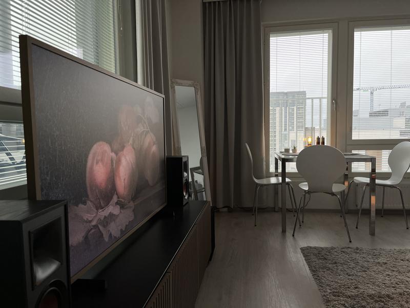 Mikäli vastasit kyllä, the frame on käytännössä ainoa vaihtoehto, mutta tekee sen mitä lupaakin. Paneeli todellakin on mattainen, kuten kuvasta näkee, ja tekstuuria omaavat öljyväri maalaukset näyttävät erehdyttävästi oikealta taululta (puhelimen kuva näytöstä ei ole koskaan imarteleva). Itse näyttö on vain tuuman paksuinen ja on mahdollista asentaa seinään kiinni ilman rakoa mukana tulevilla kiinnikkeillä. Erikseen ostettavat kehykset näyttävät erehdyttävästi puulta ja muuttavat television olemusta merkittävästi, mutta mainittakoon että melko heppoiset muovilistat maksavat 100€, joten teeveen todellinen hinta on korkeampi.