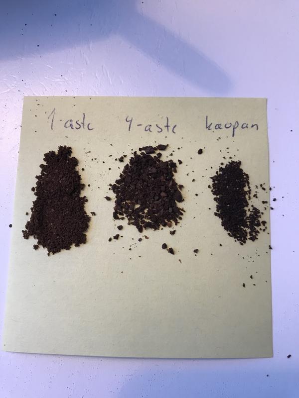 Ensimmäisenä miinus:jauhatusasteikko menee karheimmasta hienoimpaan asteikolla 8-1 ja ohjeen mukaan 4-5 on suodatinjauhatus ja 1-2 on espresso. Toiveajattelua, 1-jauhatus vastaa Löfbergin suodatinkahvia jauhatukseltaan. Kokeilin ensimmäisenä jauhatusastetta 4 ja sillä tuli sellaista murkulaa, että olisi ehkä pannujauhatukseen sopinut. Ei siis tee mitä lupailee. Kuva mukana, vasemmalla aste 1, keskellä aste 4 ja oikealla kaupan suodatinjauhatus. Asteikko on porrastettu puolen asteen välein, eli 1,5 ja 2,5 jne onnistuu.