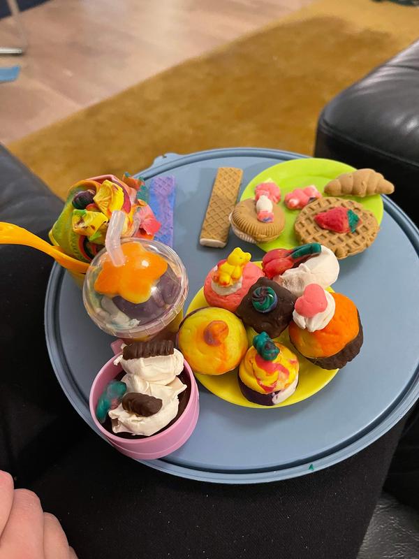 Yllätyin miten monipuolinen setti tämä oli ja oli hauskaa tehdä juoma- ja jälkkäriannoksia lapsen kanssa. Lapsi (6-vuotias) jaksoi tehdä lähes kaksi tuntia putkeen tätä annosten kokoamista. Muovailuvahaa tosin kuluu tosi reippaasti pursottimissa, että pakkauksessa tulevat, eivät riittäneet meillä kuin osaan annoksista.
