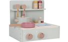 Tässä puisessa minikeittiössä voit kokkailla lempiruokiasi. Mukana leikkisetissä kattila ja paistinpannu, pieni pesuallas, kaksi lastaa, suola ja pippurisirottimet eli kaikkea mitä ateriaa varten tarvitaan.