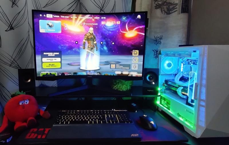Ostin BF alennuksesta ja päivitin 27” kaarevasta FHD 60Hz näytöstä. Ajattelin että haluan ison näytön surffaamiseen, ja koon mukana pitää suurentaa resoluutiota. Surffaamisessa näyttö on niin ’valtava’ että etäisyyttä näyttöön pitää saada huomattavasti enemmän kuin 27”, ja taustavaloa tarvitaan tai silmät seisoo päässä jonkun tunnin jälkeen. Pöydän syvyys ei riittänyt, joten ostin näyttötelineen jolla saan näytön käytännössä pöydän reunan takapuolelle että sain etäisyyttä.