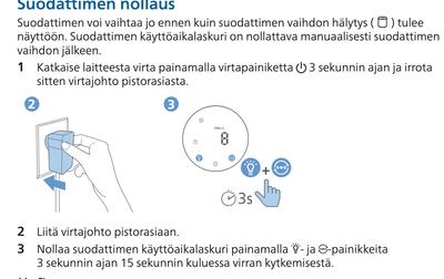 Ohjekirjan ohje suodattimen puhdistuksen kuittaamiselle sekä suodattimen vaihdon kuittaamiselle on hieman ristiriitainen. Voisitteko täsmentää tämän kohdan ohjekirjasta, eli millä näppäinyhdistelmällä kuitataan suodatin puhdistetuksi ja millä näppäinyhdistelmällä kuitataan suodatin vaihdetuksi. Kiitos!