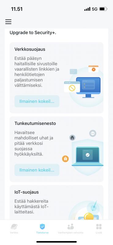 Laadukkaanoloiset Mesh purkit, verkon pystytys superhelppoa mobiili appilla mutta pikkasen liikaa maksullisia lisäominaisuuksia, silti normaalikäyttöön varsin hyvät ilman lisämaksuja ja purkkien välinen wi-fi-6 linkki toimii kuin rasvattu salama. Olisi mennyt koko talo yhdellä purkilla, toinen on jo vähän hienostelua ja kolmas meni yli, mutta kuuluupahan wi-fi myös suihkussa sekä saunan lauteilla :D
