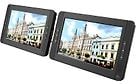 Kahdella 10" näytöllä ja sisäänrakennetulla akulla varustettu kannettava DVD-soitin. Soittimen voi kiinnittää autoon mukana tulevien niskatukikiinnikkeiden avulla.