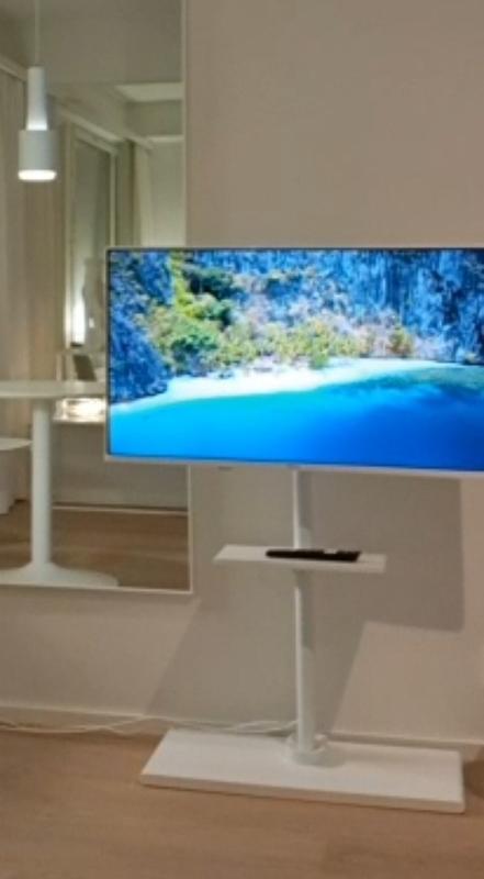 Kuvissa toimivan näköinen. Tarkoitukseni oli laittaa teline ns. TV-tason taakse, että varsinaisen tason päälle olisin voinut laittaa muuta. Tuo telineen pystyputki on kuitenkin niin paksu, eikä lattialle tulevan laattaosan takareunassa, joten taso jäi hassusti kovin paljon irti seinästä eli tuote ei toiminut meillä haluamallani tavalla, joten palautukseen lähti.