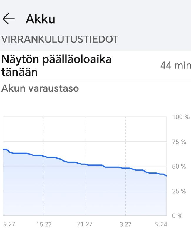 Nyt kolmas vuorokausi menossa edellisestä latauksesta ja akkua 37% jäljellä! Edellinen luuri samalla käytöllä oli joka päivä piuhassa Xiaomin 11t pro. Kamera on tosi hyvä. Kyllä on seuraavakin luuri Honor 😬 ohessa akun purkaus kaavio vuorokauden sisään.