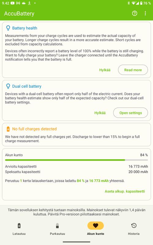 RT6 on nyt ollut aktiivikäytössä päivittäin marraskuun -23 puolivälistä. Valitettavasti näyttää siltä että akkukapasiteetti on pudonnut ilmoitetusta 20 000 mAh:sta neljänneksellä. Alussa lataus piti tehdä noin joka kuudes päivä, nyt joka neljäs päivä. Käyttö on ollut samanlaista: mediaa ja somettamista sisätiloissa useita tunteja päivässä. Lataukset tehty laitteen omalla pikalaturilla. AccuBattery-äppi asennettu laitteeseen ennen viimeisintä latausta ma-iltana 12.2.24. Se näyttää nyt akun kapasiteetiksi 16 773 mAh. Liekö yksilövika vai ominaisuus, jää nähtäväksi. Tiedossa ei ole pitääkö akku vaihtaa ennen aikojaan, toivottavasti takuu korvaa.