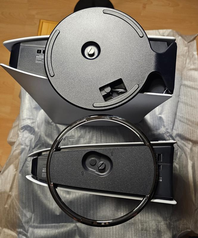 (liitteenä olevassa kuvassa ylempänä näkyy PS5 oman konsolin mukana tulleen pystyständin kanssa, ja alempana näkyy PS5 Pro tämän kyseisen pystyständin kanssa )