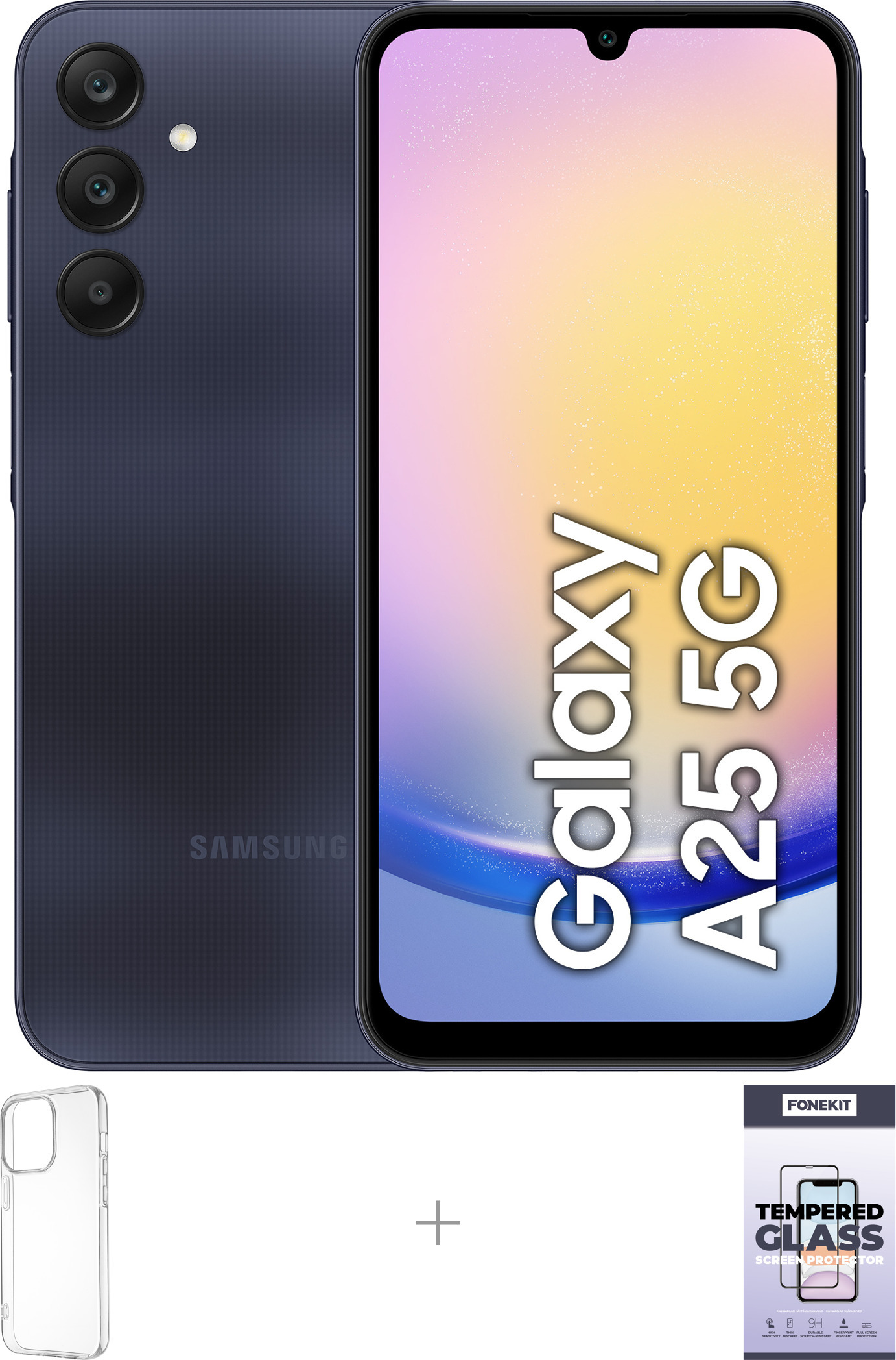 Samsung Galaxy A25 5G -puhelin, 128/6 Gt, musta + silikonisuoja ja panssarilasi