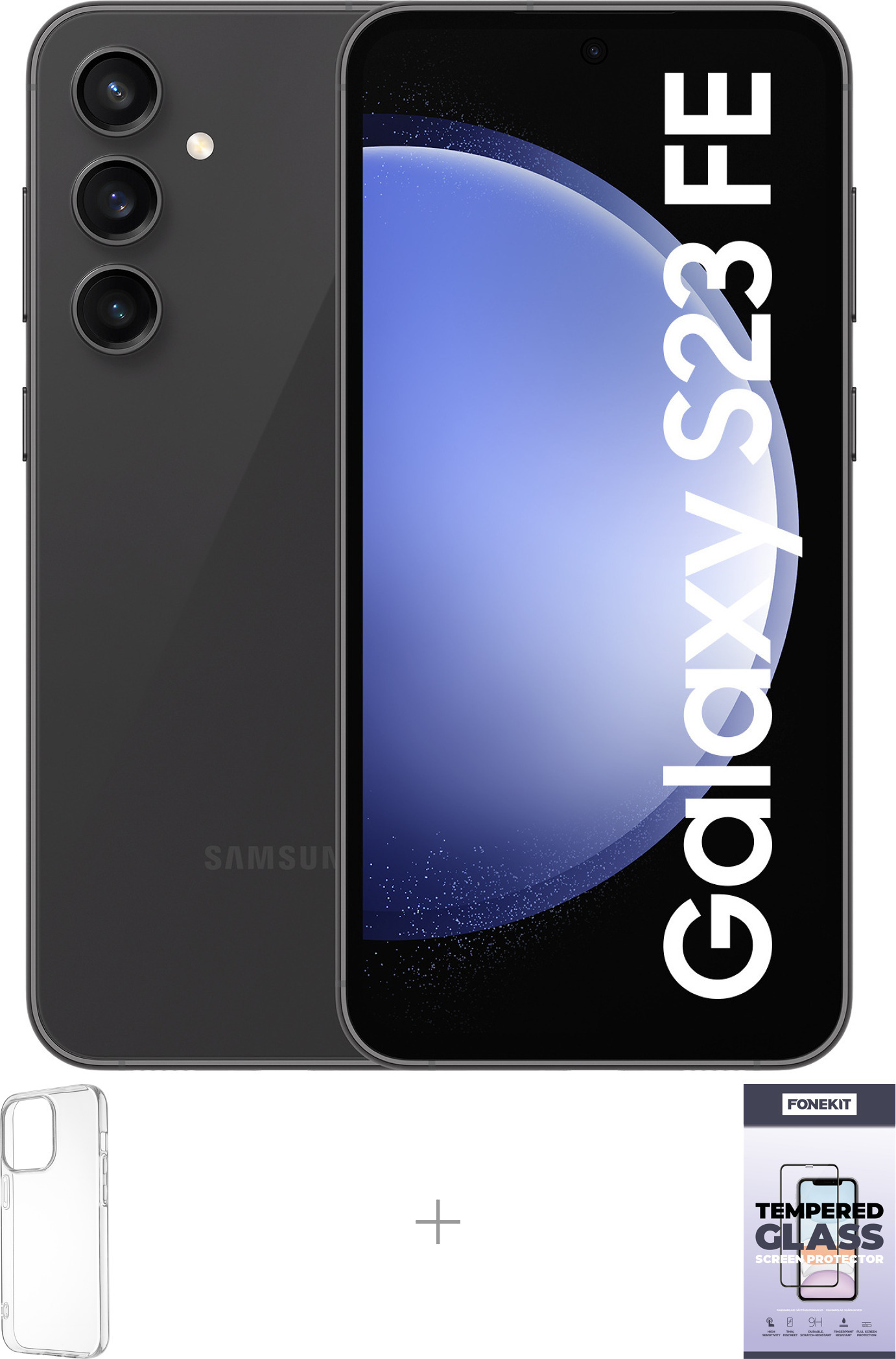 Samsung Galaxy S23 FE 5G -puhelin, 128/8 Gt, musta + silikonisuoja ja panssarilasi