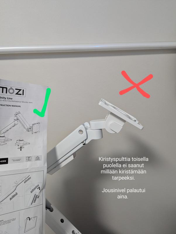 Olkaa varovaisia asennuksessa isomman näytön kanssa, jouset aika löysälle säädetty alkuun tai tuntuu helposti jäykiltä, mutta yllätyin kun laitoin näytön paikoilleen. Jousi oli kyllä helppo säätää.