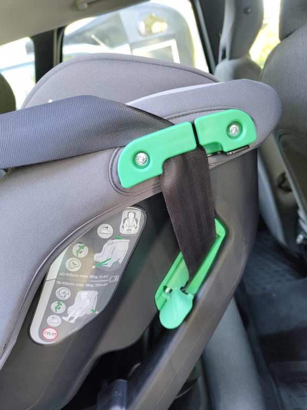 Ja nyt seuraa se ongelmakohta: Vyö on tässä vaiheessa kulkenut istuimen sivua ylöspäin näiden vihreiden klipsien välin ja nyt vyön pitäisi tehdä 90 asteen käännös ylemmän klipsin kohdalla ja lähteä auton penkin selkänojassa olevaa kelaa kohti. On ihan päivänselvä asia, että onnettomuustilanteessa istuimesta repeää ohut muoviklipsi irti/poikki jonka jälkeen vyöt vapautuu noin 40-60cm ja istuin mahtuu helposti tekemään takapenkillä kuperkeikan. En suosittele missään nimessä!