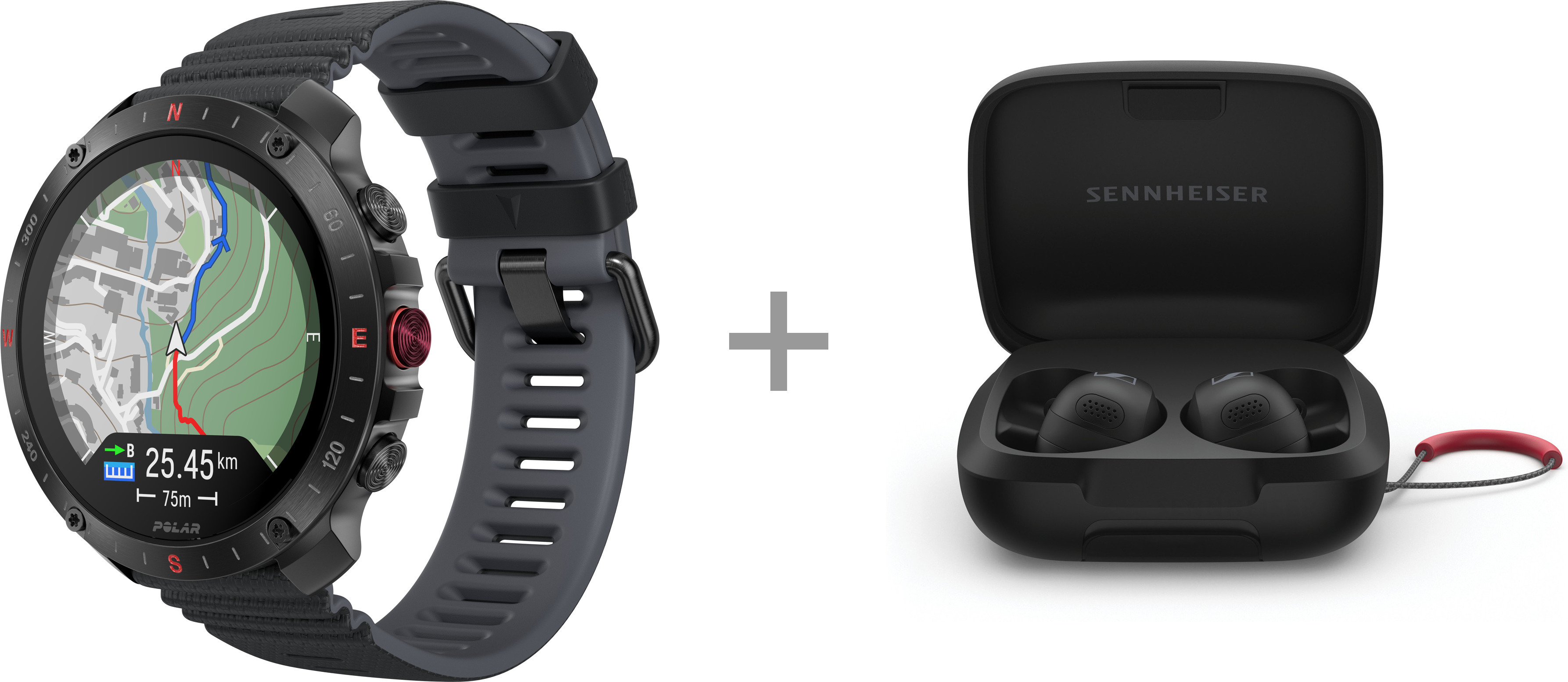 Polar Grit X2 Pro -urheilukello, musta silikoniranneke + Sennheiser MOMENTUM Sport -kuulokkeet, musta -tuotepaketti
