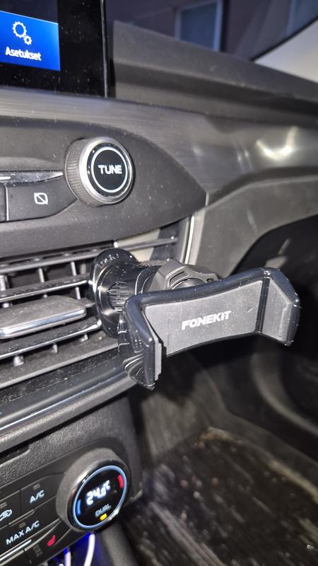 Pienikokoinen ja puhelin pysyy hyvin telineessä. Kiinnitin voisi olla aavistuksen pidempi, niin telineen saisi helpommin kiinni ritilään.