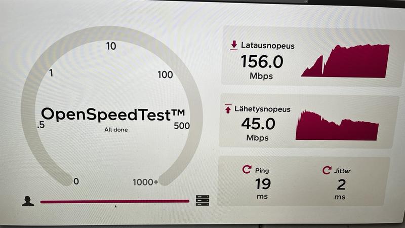 Edellisellä 4G routterilla sai downloadia vaihtelevasti 30-40Mbs 4G verkossa. Heti vaihdon jälkeen mittasin downloadin 156Mbs ja uploadin 45Mbs rj45piuhalla purkin kyljestä ja liittymä on saman DNA operaattorin 4G max 200Mbs. Ero on huima! Lisäantenneja ei ole käytössä ja näillä kokemuksilla niihin ei ole tarvetta. Etäisyys tukiasemaan on 1,85km
