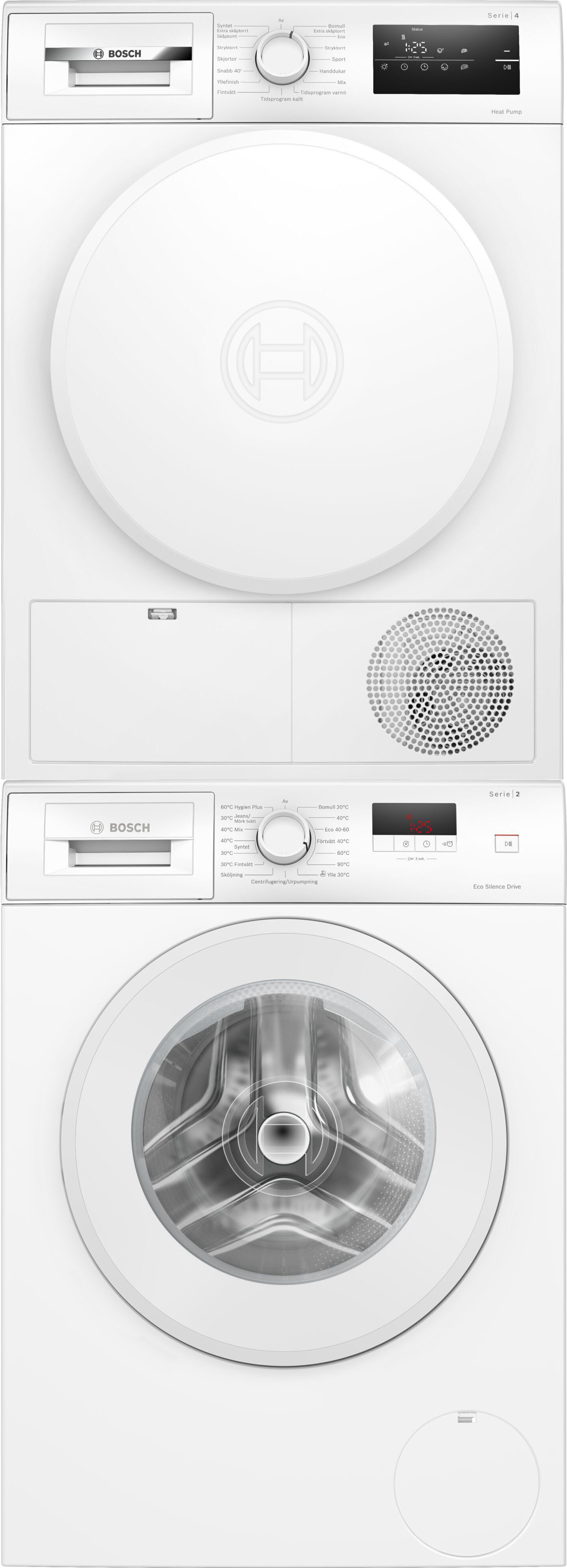 Bosch WGE02400SN Serie 2 pyykinpesukone ja Bosch WTH8300LSN Serie 4 kuivausrumpu